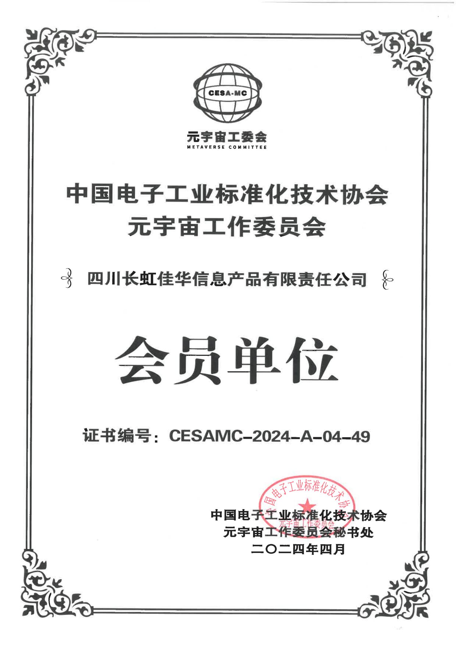 【信產(chǎn)】中國(guó)電子工業(yè)標(biāo)準(zhǔn)化技術(shù)協(xié)會(huì)元宇宙工作委員會(huì)  會(huì)員單位證書