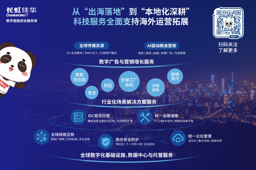 面對企業(yè)出海在合規(guī)、網(wǎng)絡(luò)、營銷與本地化上的多重挑戰(zhàn),長虹佳華整合全球資源,推出可靈活組合的解決方案體系: